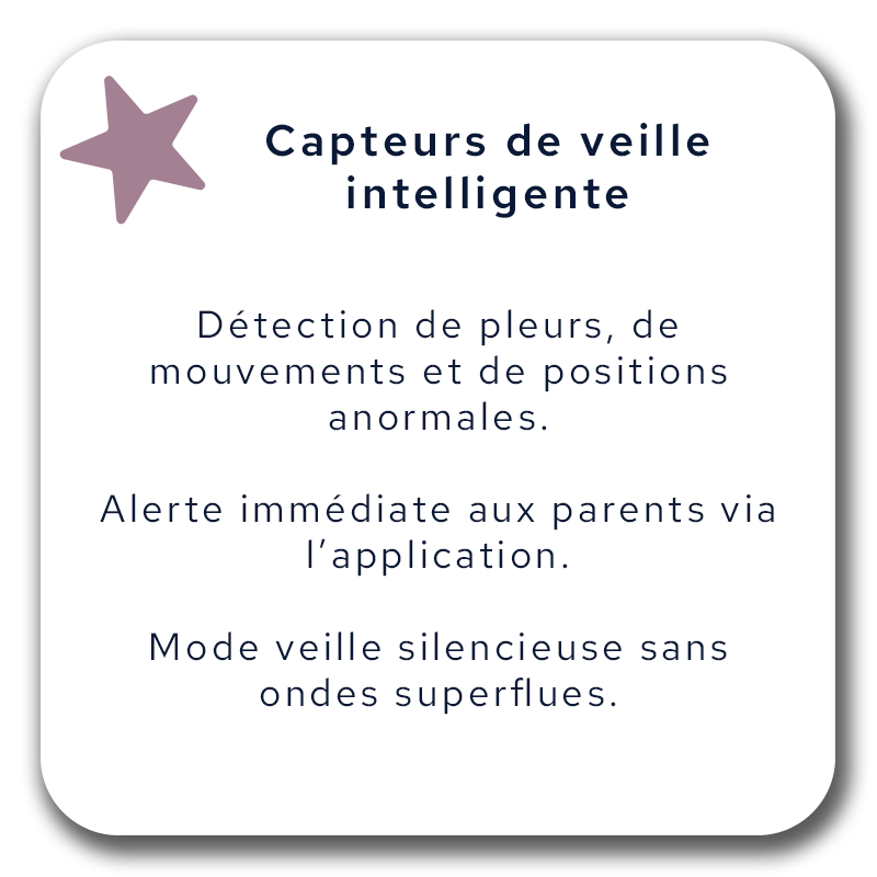 Dormez sur vos deux oreilles. Euno veille en silence dans la chambre de l’enfant. Grâce à ses capteurs et à son intelligence artificielle embarquée, il détecte : ● les pleurs ou les bruits anormaux, ● une mauvaise position pendant le sommeil, ● des mouvements inhabituels ou un éveil prolongé. Vous recevez une alerte immédiate sur votre téléphone, pour intervenir si nécessaire — tout en évitant les fausses alertes.